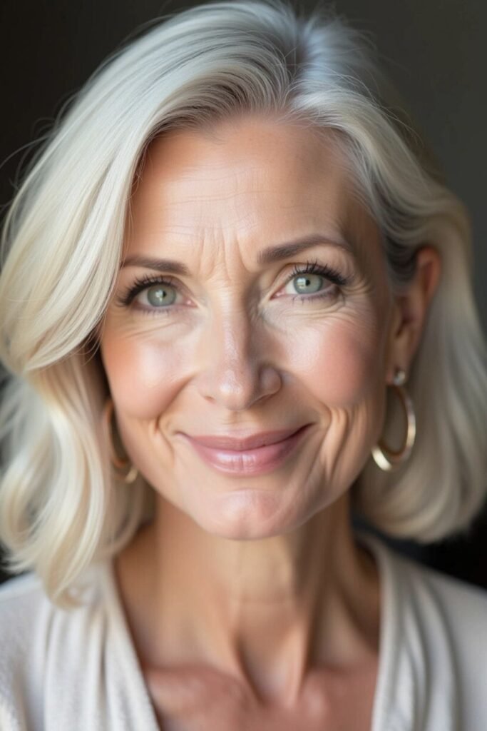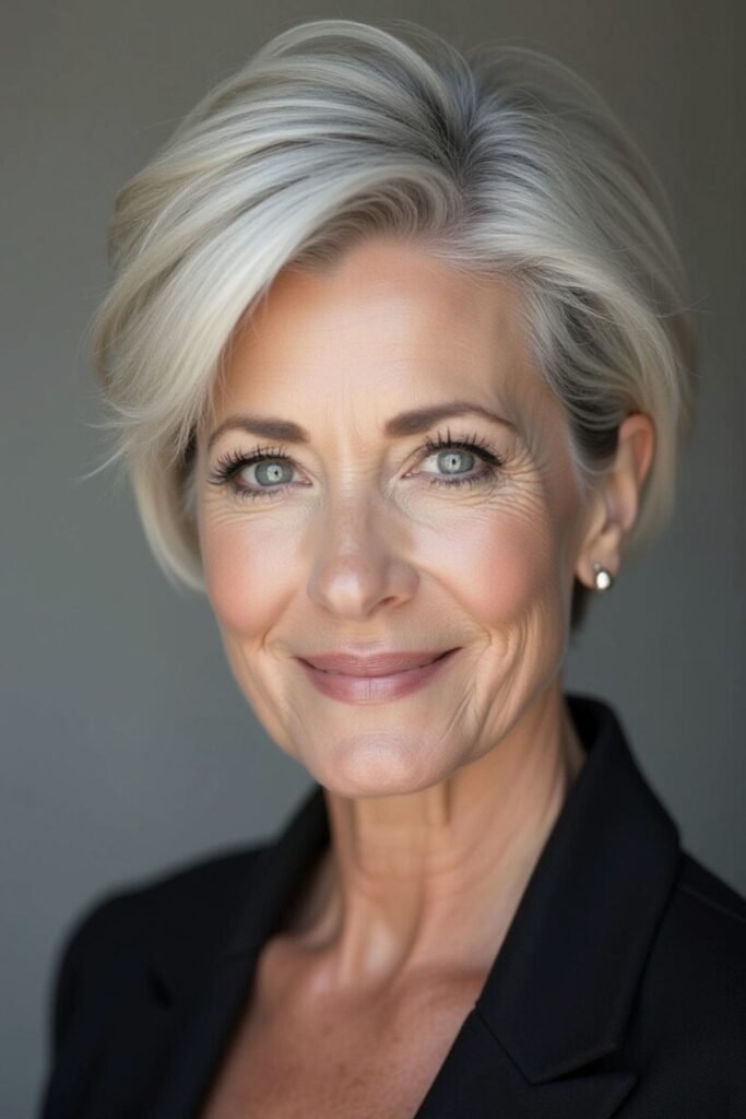 Pulling the hair back this smoothly instantly sharpens your features in the best way, and it works beautifully when your hair has a natural silver tone.