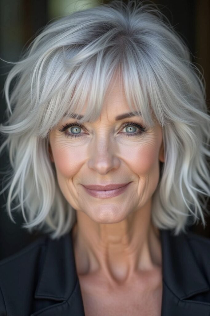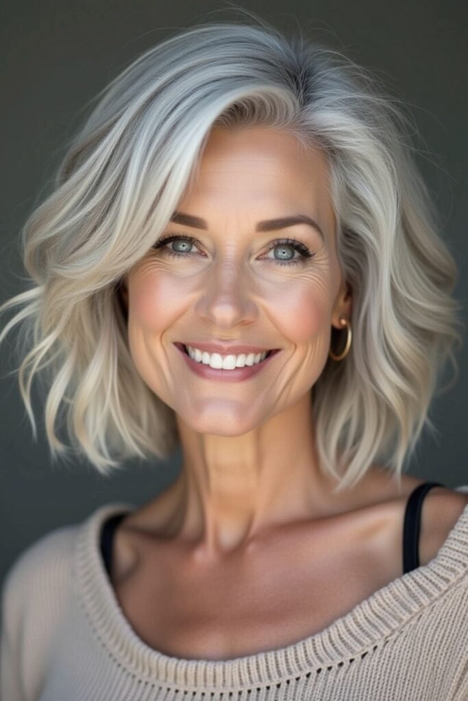 Length like this works beautifully when your hair has a mix of silver and depth because the lighter pieces fall in a soft, blended way that brightens your face.