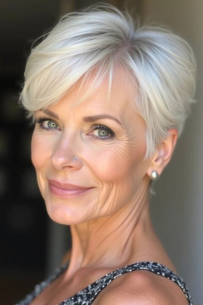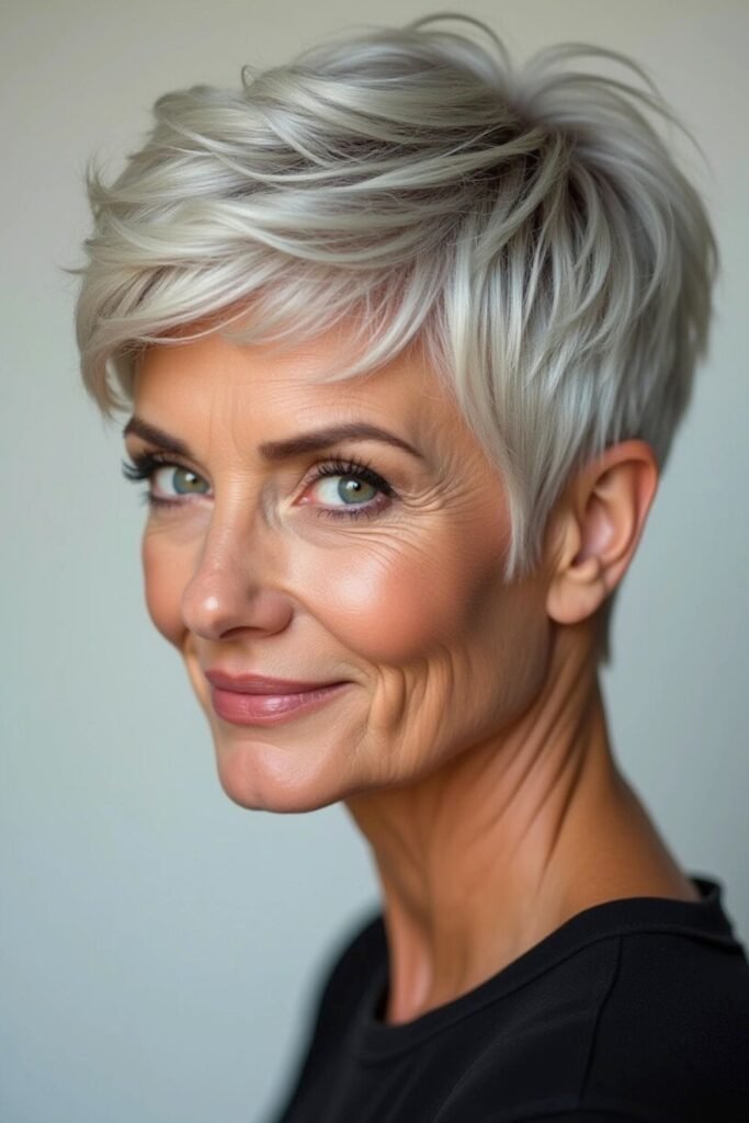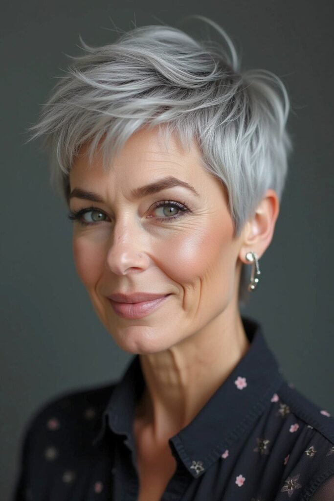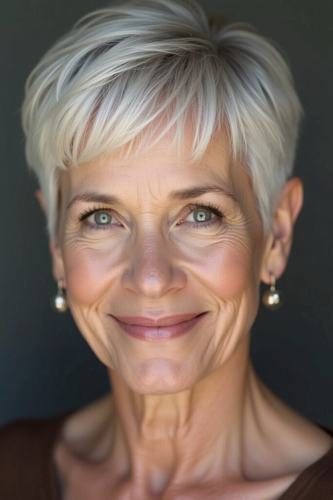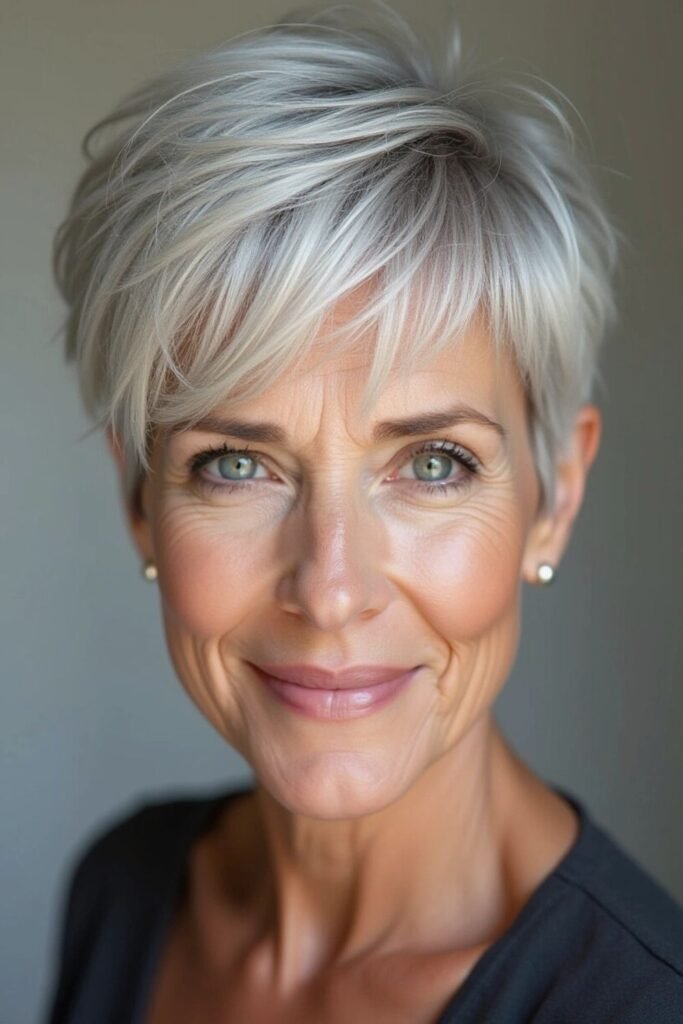 Short layers styled forward like this bring a fresh, lifted feel that suits anyone who wants a low-maintenance cut with a modern edge.