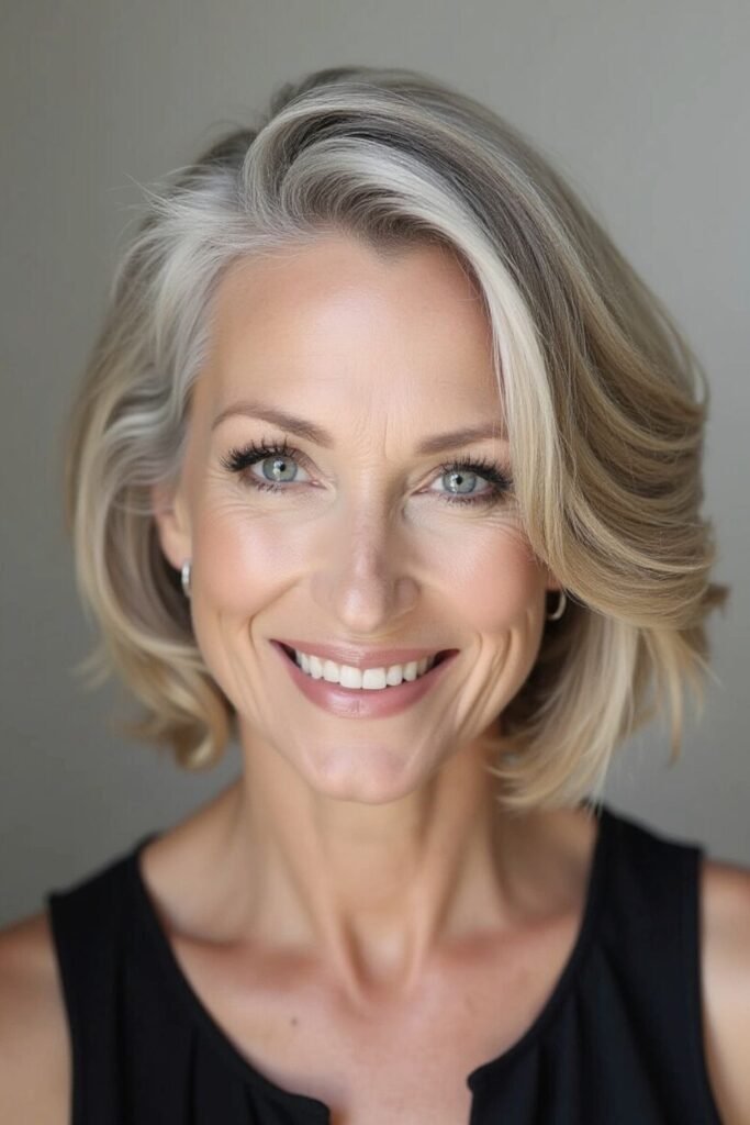 This style looks great on hair that already has silver streaks in it since the lighter sections around the face make your skin look brighter right away.