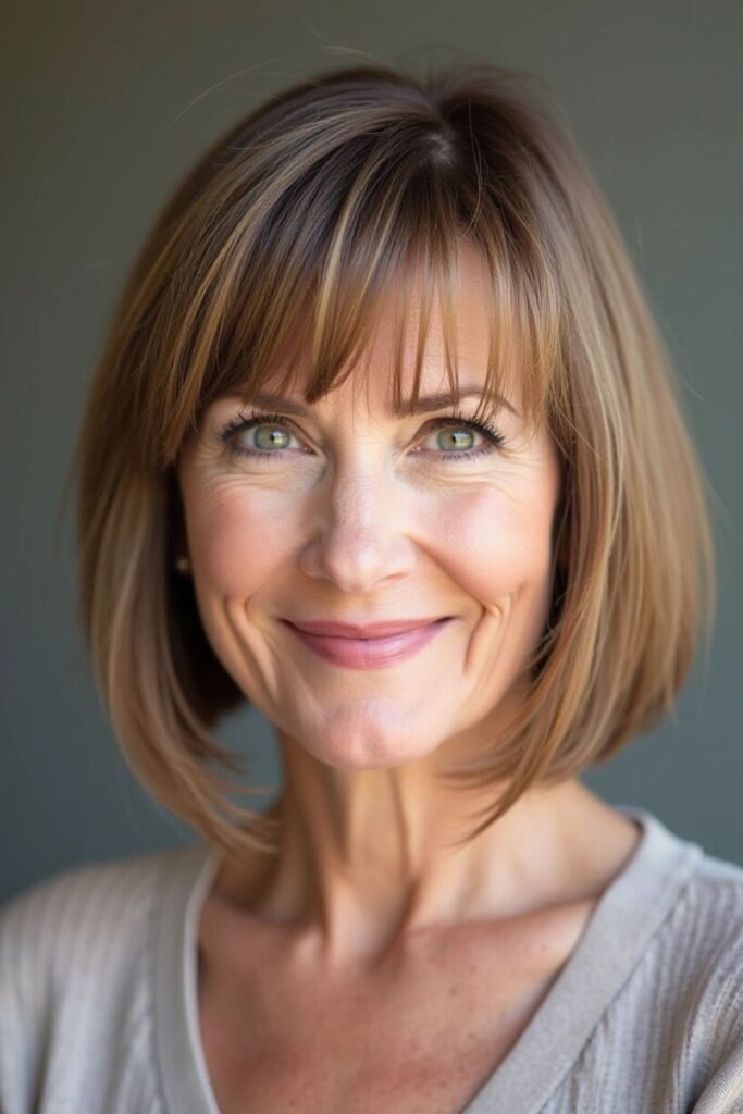 Tell your hairdresser you want a blunt bob that sits just below the chin with lightly textured bangs so they fall softly instead of sitting heavy.