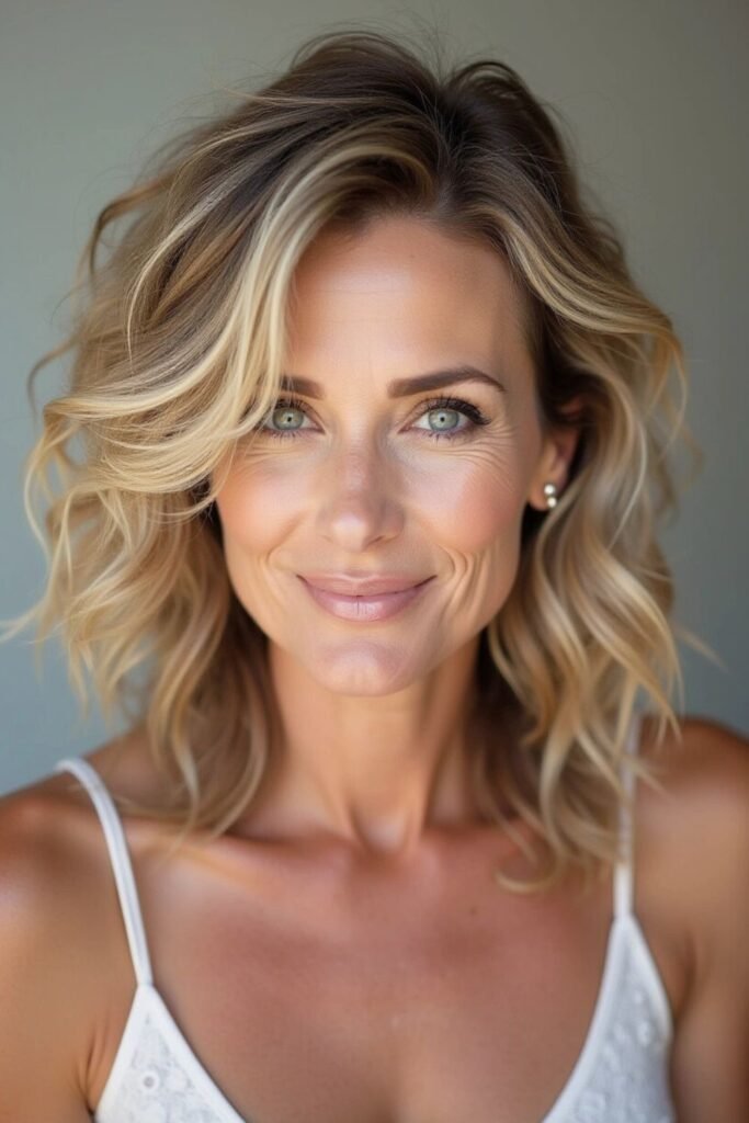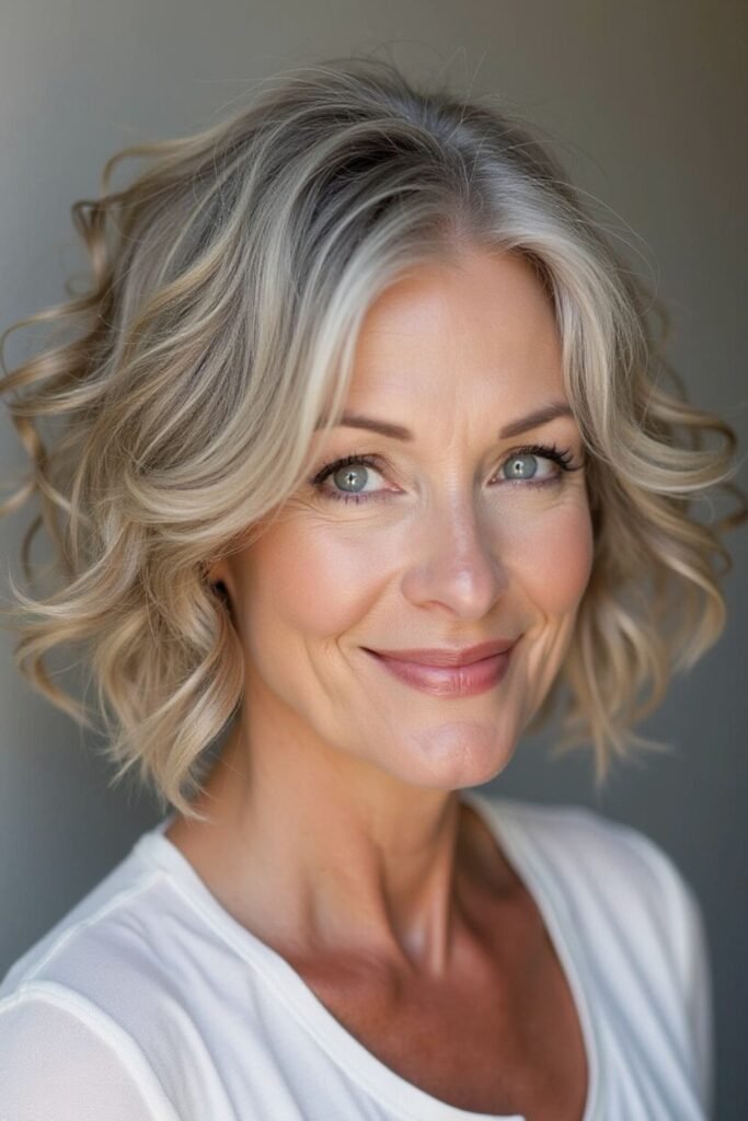 Ask your stylist for a short wavy bob with textured ends and long side-swept bangs to keep the front mild.