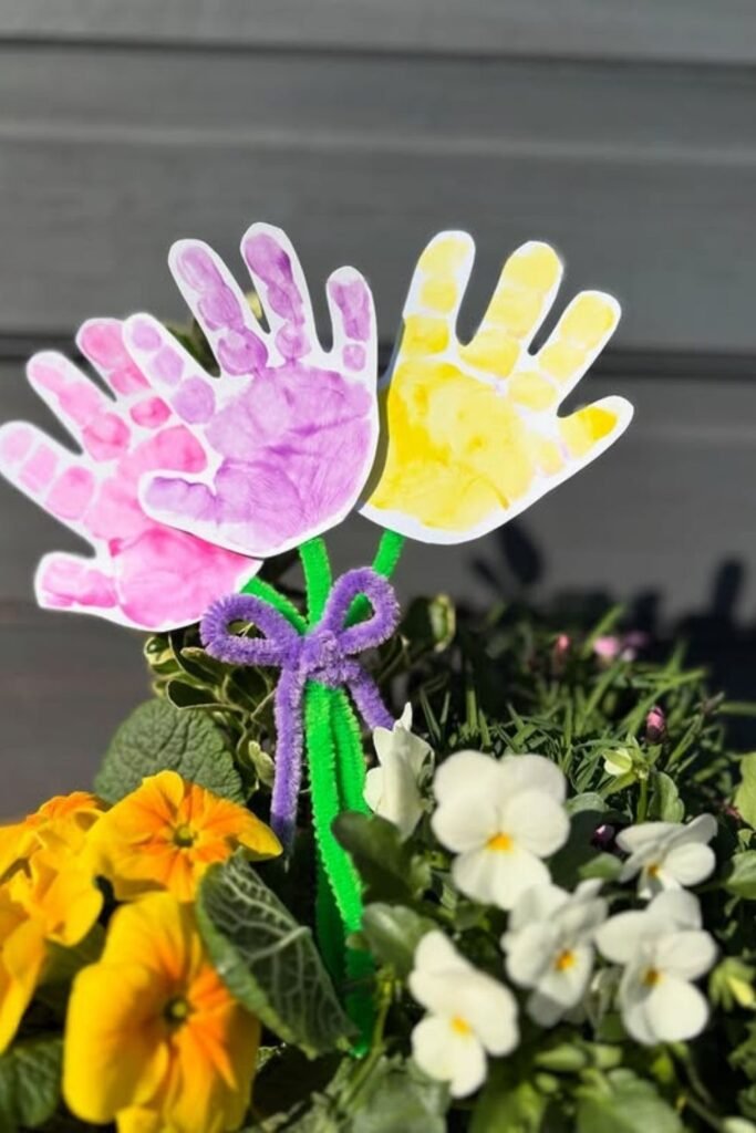 Little hands become flowers you can actually keep. Painting palms, pressing them on paper, and adding pipe cleaners.