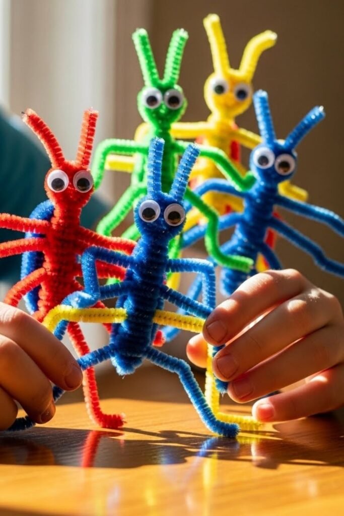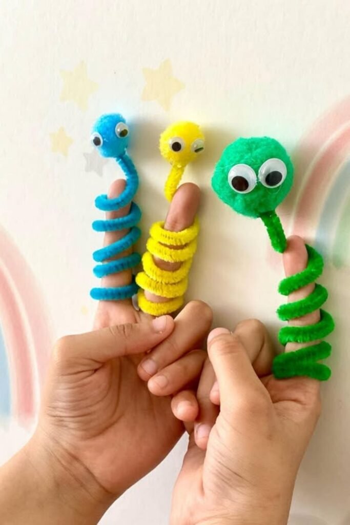 Wiggly play keeps kids interested longer than flat crafts. Wrapping pipe cleaners around fingers turns hands into moving characters in seconds.