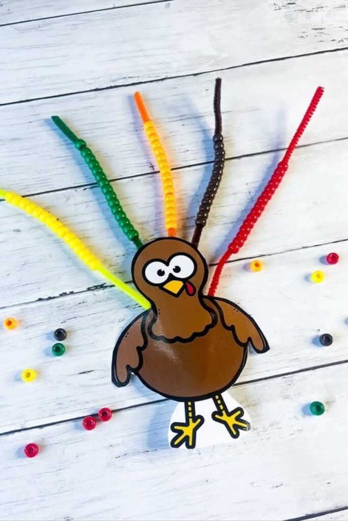 Holiday crafts go smoother when the main shape is already done. Adding beaded pipe cleaners as feathers lets kids focus on threading.