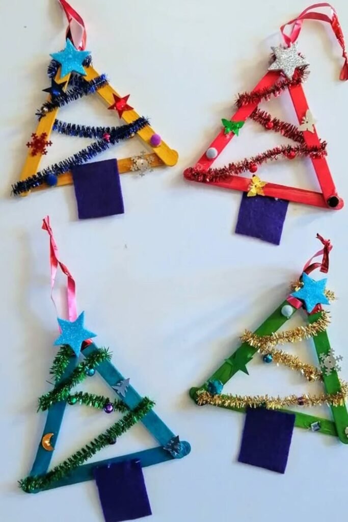 Seasonal crafts feel less stressful when kids decorate instead of build from scratch. Adding pipe cleaner garlands to simple triangle frames works well.