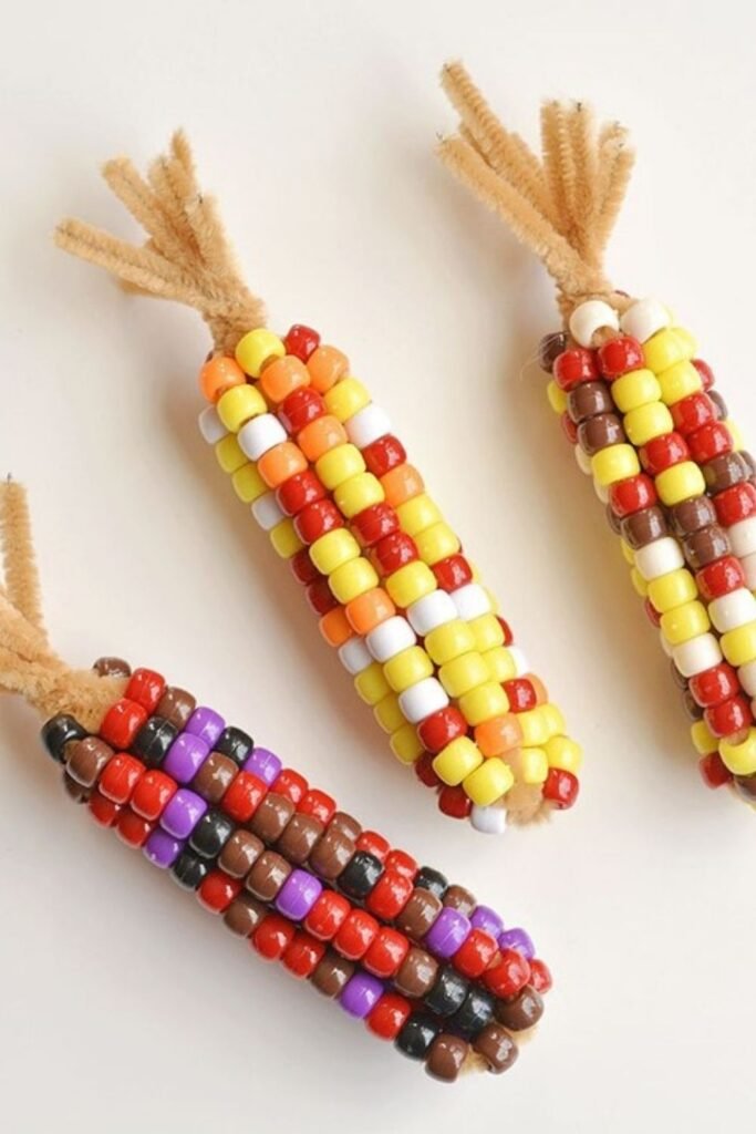 Fall themes feel easier when kids build something that already has a clear shape. Sliding beads onto folded pipe cleaners creates a corn cob that holds together without glue.