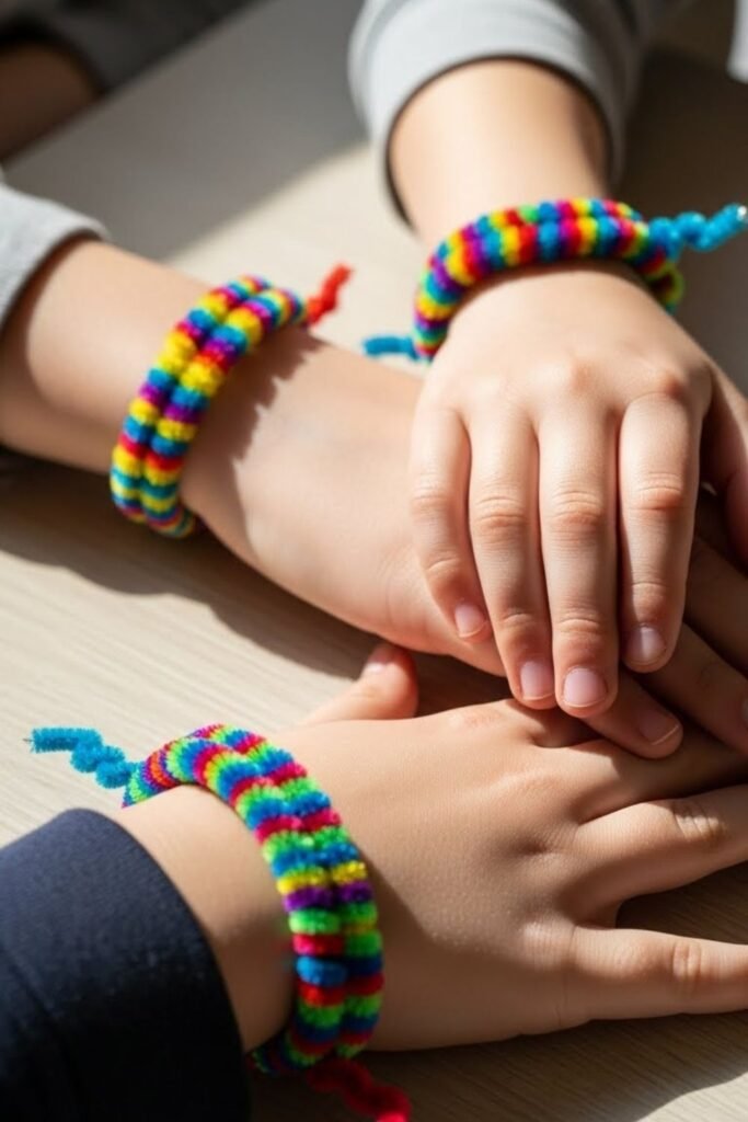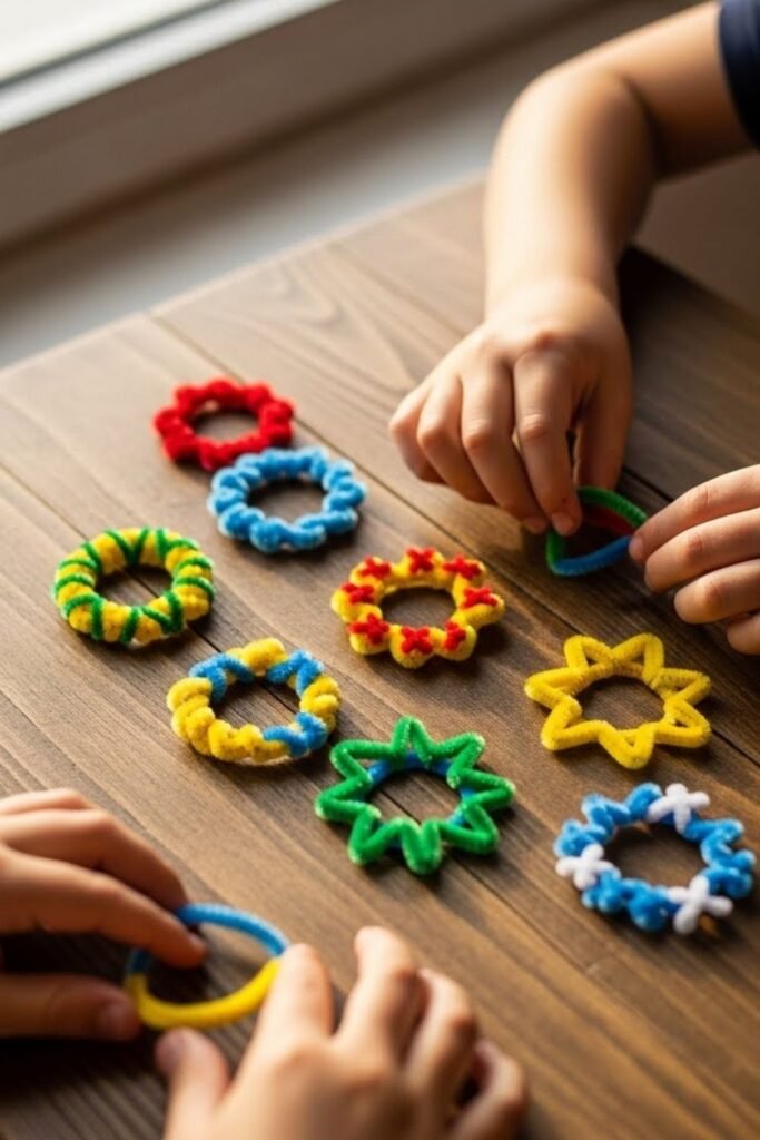 Repetition feels rewarding when kids control the design. Sliding pipe cleaners into bracelet shapes lets patterns take center stage.
