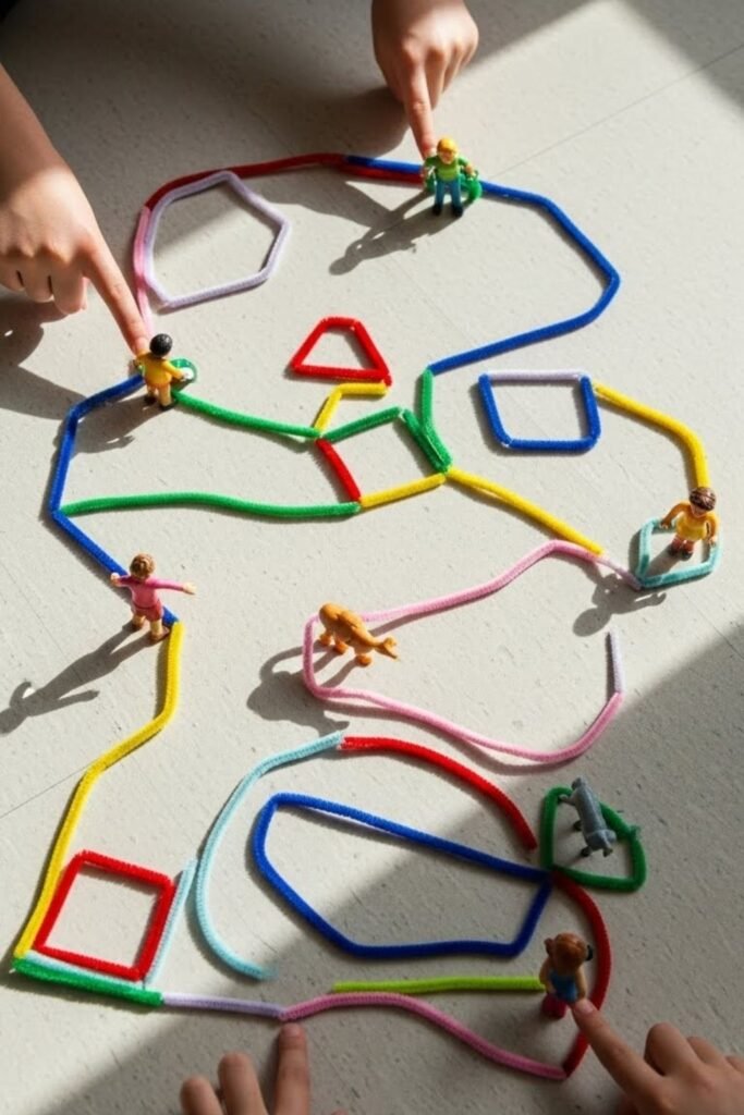 Movement helps learning stick. Twisting pipe cleaners into lines, curves and corners creates paths kids can trace with fingers or small toys.