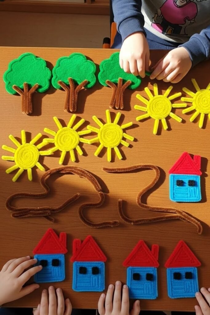 Ideas flow faster when kids can hold characters. Shaping pipe cleaners into tiny symbols trees, suns, houses creates story pieces for oral storytelling.