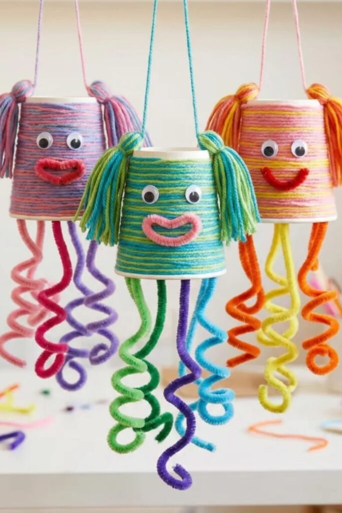 Movement makes crafts more exciting, and dangling pipe cleaner legs do exactly that. Wrapping yarn around small cups creates sturdy bodies.