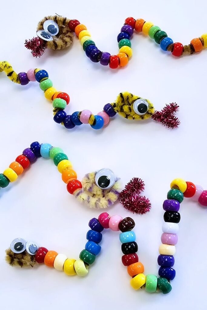 Bright beads threaded onto pipe cleaners turn into flexible snakes that kids can bend, twist and reshape without help.