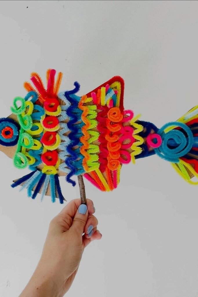 Bright colors pull kids in and keep their hands busy longer than you expect. Layering pipe cleaners into a fish shape.