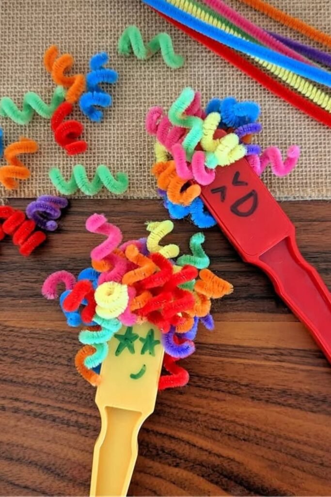 Laughs come fast when kids turn everyday tools into characters. Twisting short pipe cleaner pieces into wild hair works great for quick crafts or indoor movement breaks.