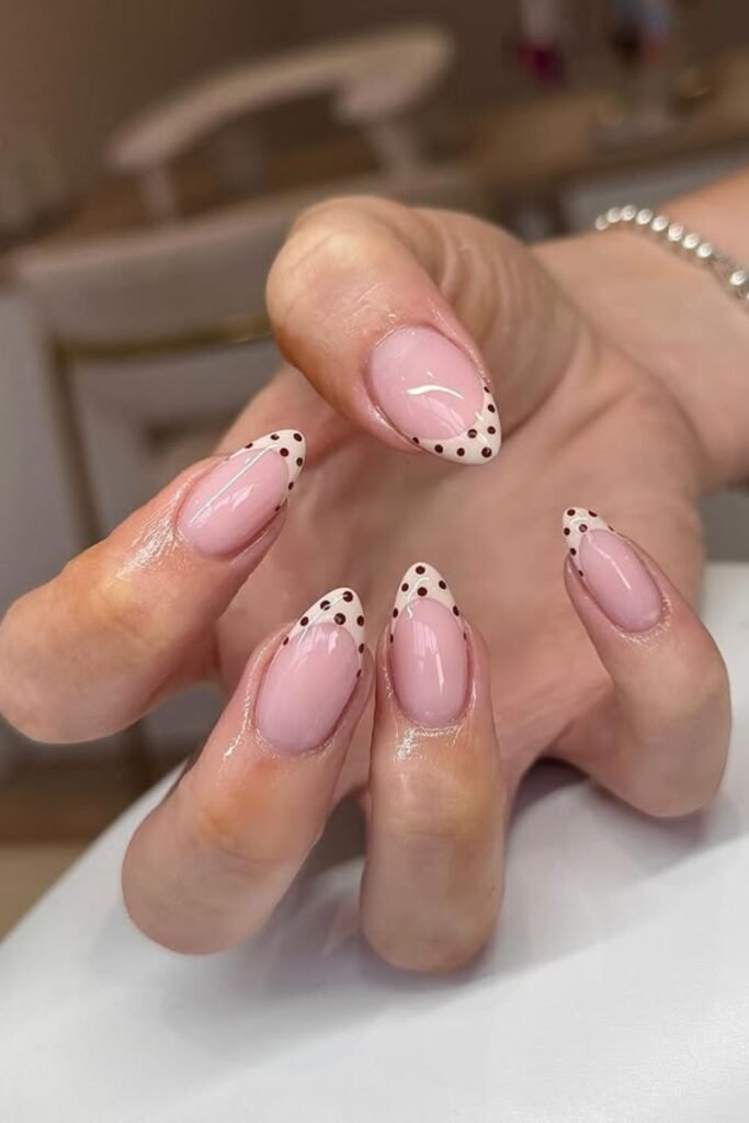 Soft blush nails paired with tiny chocolate-brown dots create an elegant, minimalist design that feels both feminine and modern.