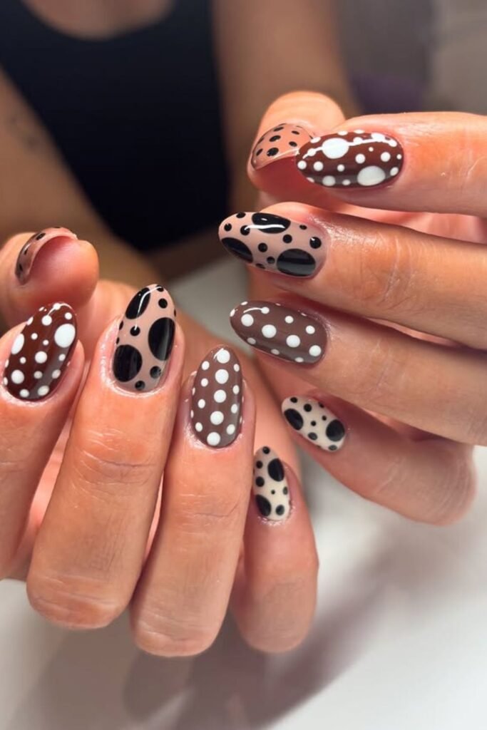 Each nail has its own tale. Brown, nude, and gray bases trade places with black and white dots of varied sizes, making a fun clash that still looks classy.