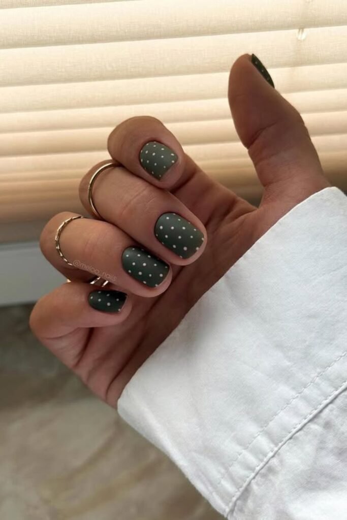 Earthy tones meet minimalism with these matte sage nails dotted in soft white.