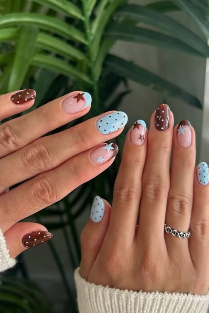 Cool blue and warm brown come together for a dreamy mix of dots and stars.