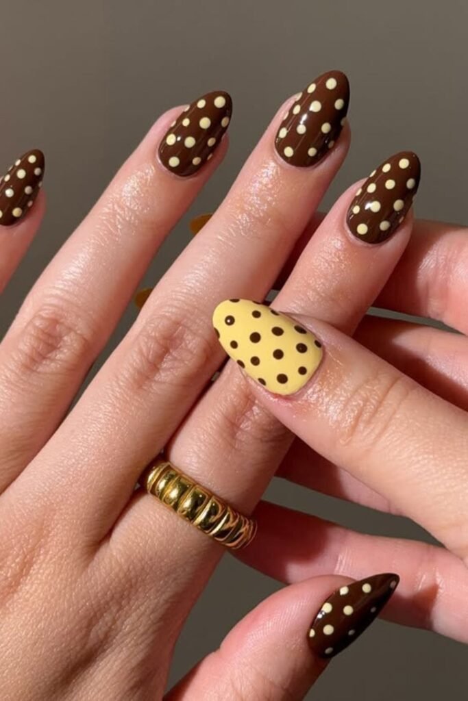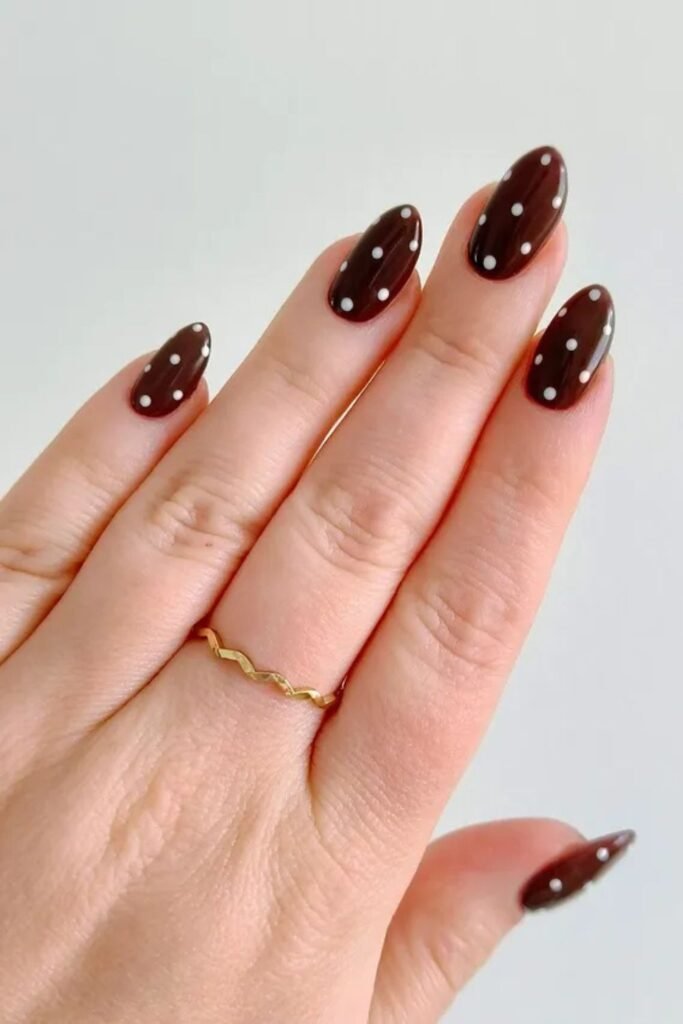 Deep brown polish instantly adds warmth, while crisp white dots bring a touch of retro charm.