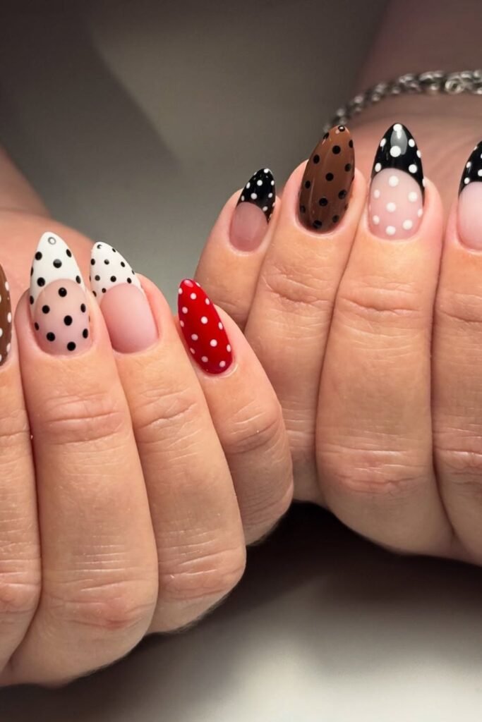 Each nail has a different color combination, such black on nude, red on white, or brown with creamy dots.