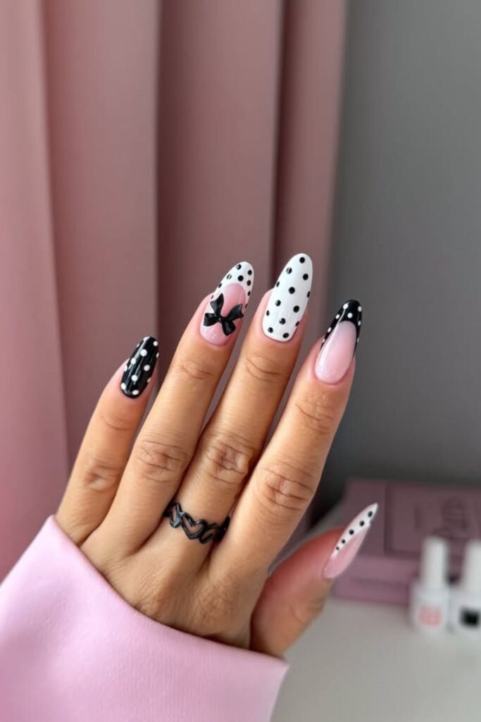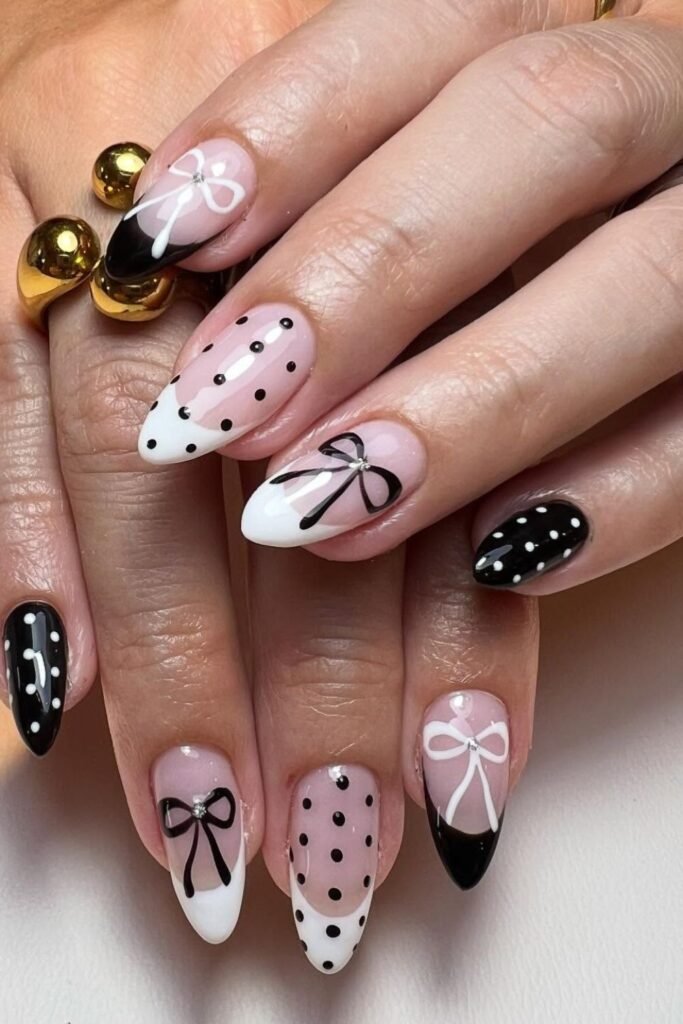 Elegance gets a playful twist with these black-and-white polka dot nails tied together by dainty bow accents.