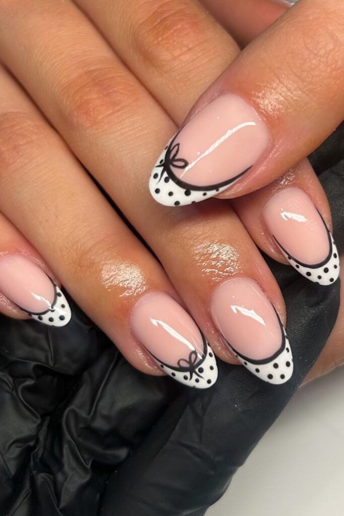 Polished and feminine, these French tips mix tiny black dots with hand-drawn bows for a classy, Paris-inspired design.