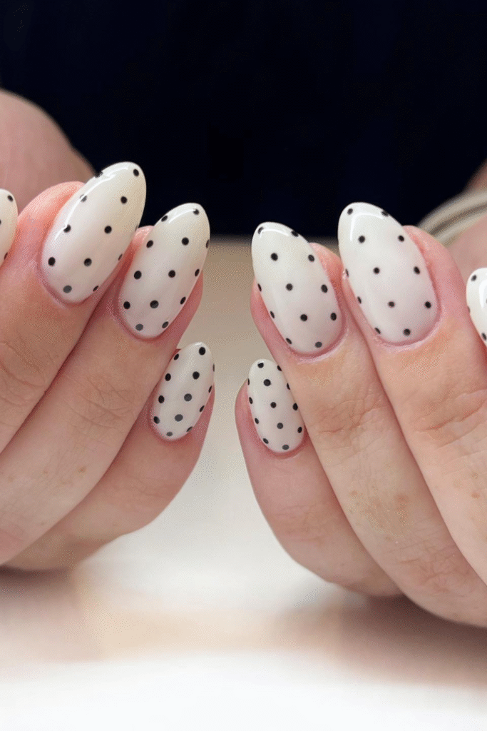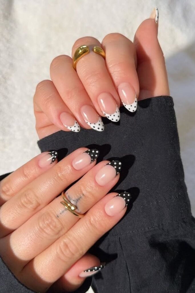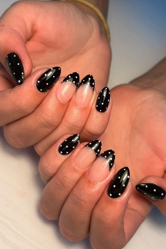 Classic French nails get a bold upgrade with black tips covered in neat white dots.