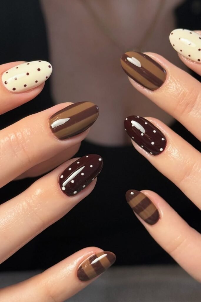 Warm tones of coffee, caramel, and cream blend beautifully in this striped and dotted nail combo.