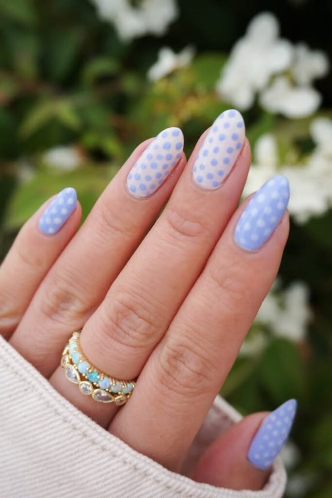 Soft and dreamy, these periwinkle blue nails with lighter dots bring a calm, springtime feel to your look.