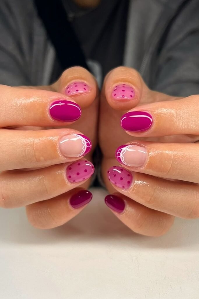 The solid berry nails, pink dots, and scalloped French tips give it a trendy and sexy look.