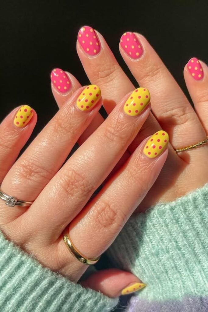 These nails are pure sunshine energy alternating neon pink and bright yellow bases with opposite-colored dots for a cheerful, summer-ready vibe.