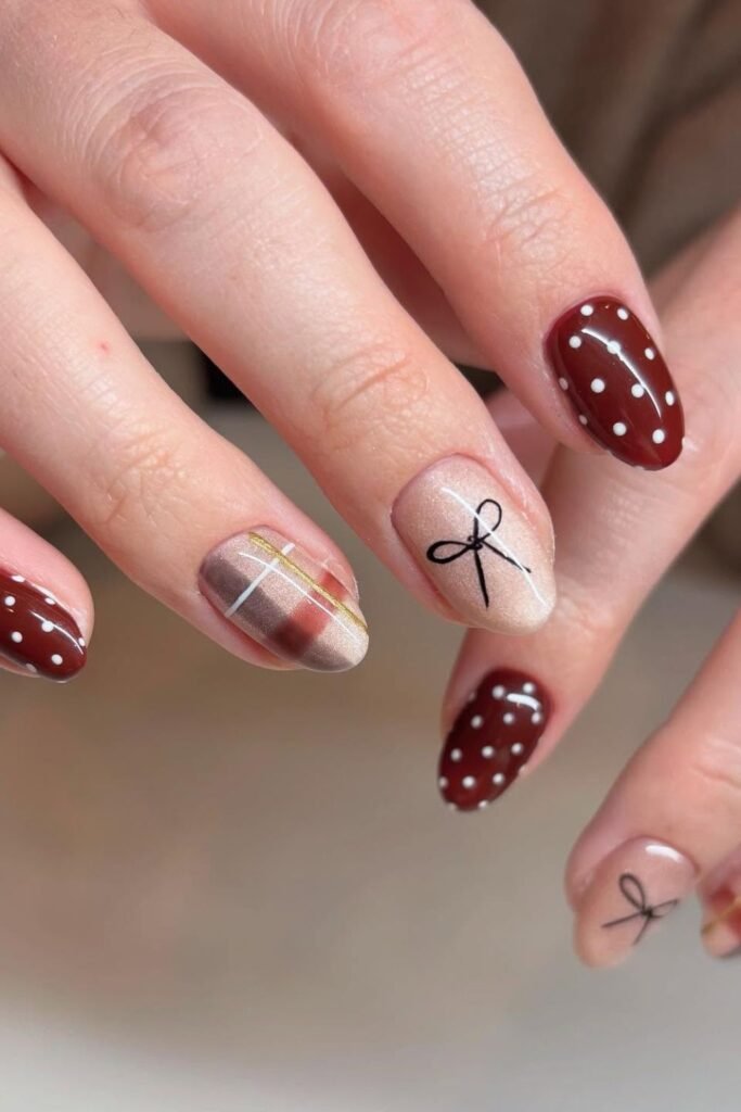 Perfect for fall, these nails blend warm burgundy tones, playful polka dots, and delicate plaid for a look that feels both chic and seasonal.