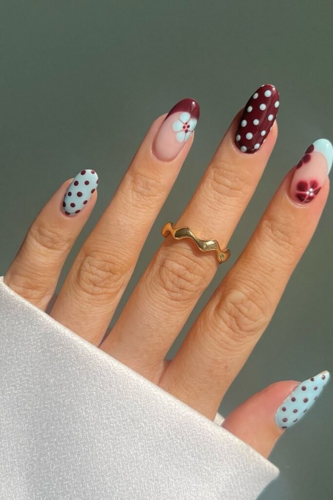 Fresh yet classy, these mint and maroon nails mix playful dots with delicate floral accents for a perfectly balanced look.