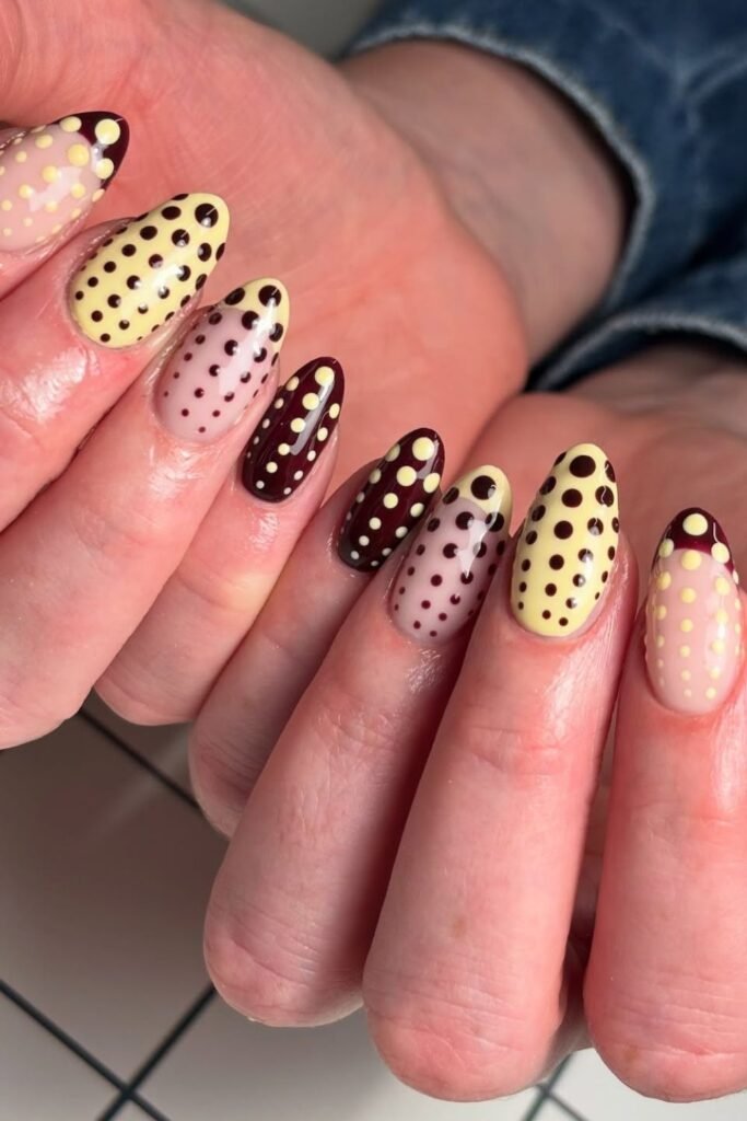 Unexpected color pairing steals the show here creamy yellow and deep maroon dots arranged in gradient lines that stretch from cuticle to tip.
