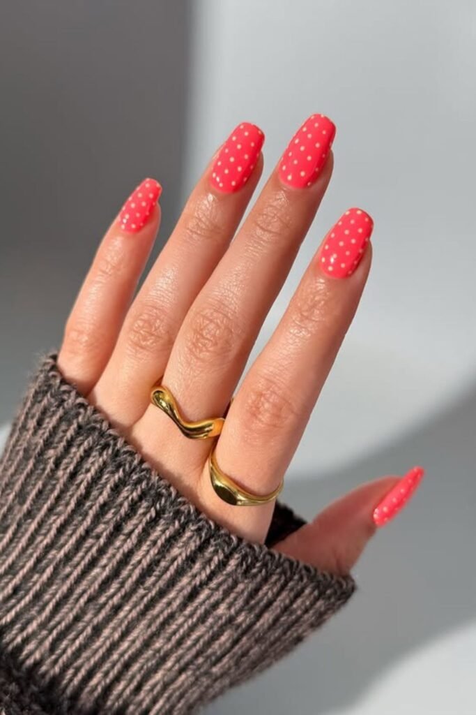 Bright coral nails bring instant joy, especially when paired with soft cream dots that add a playful.