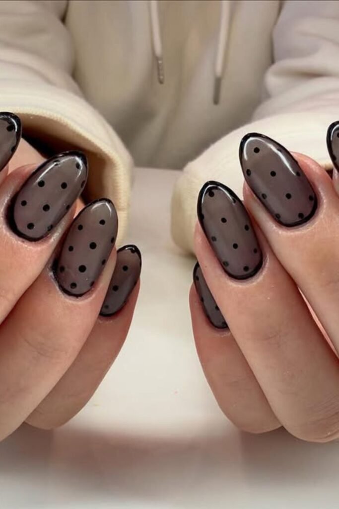Soft transparency meets edge in these sheer black polka dot nails.