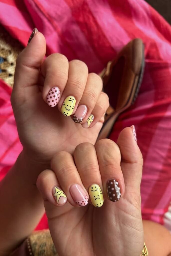 Fun energy jumps off these nails with pastel yellow smiles, pink polka dots, and brown accents all mixed in one look.