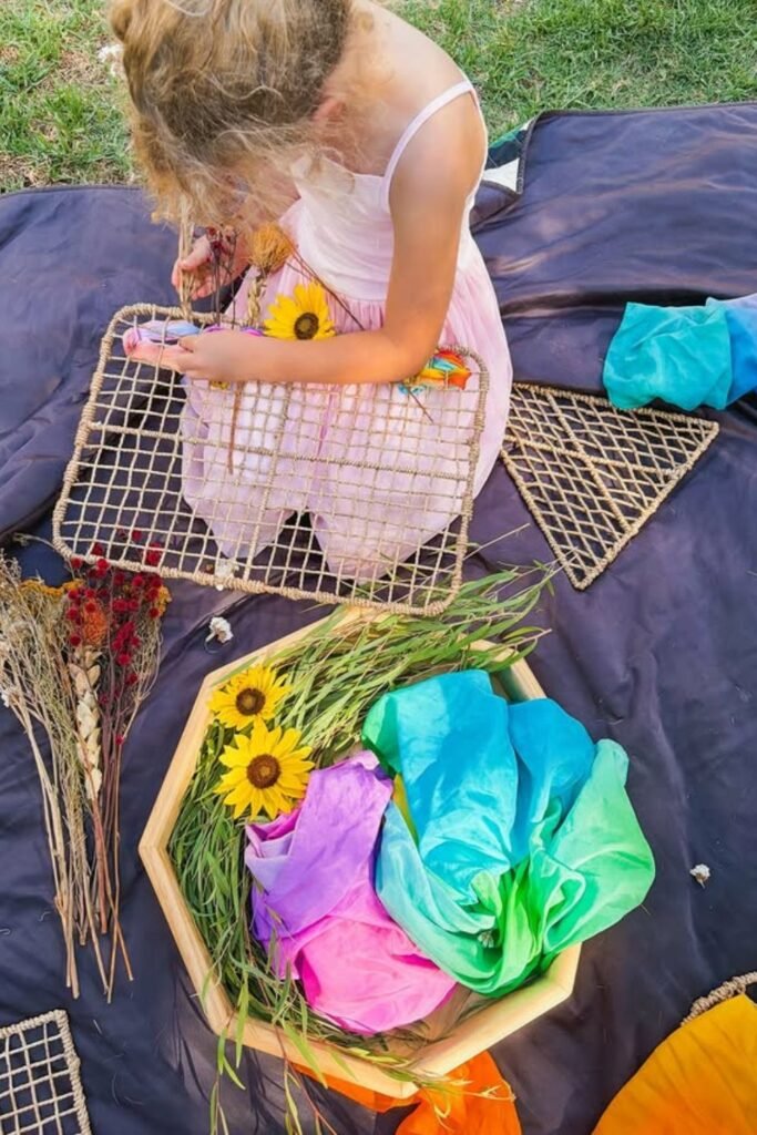 Outdoor quiet feels different it’s deeper. Hand over a simple woven mat or basket and a pile of flowers, grass, or colorful tissue.