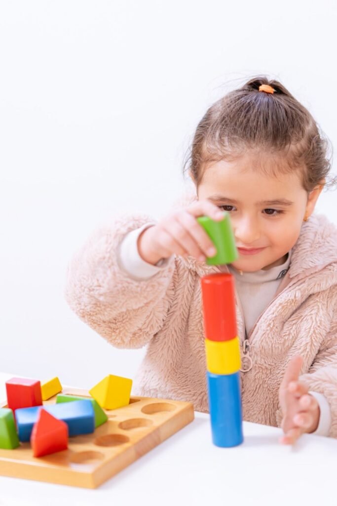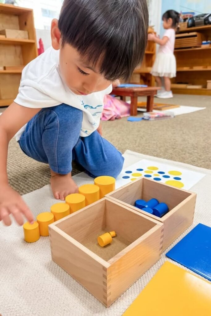 Order brings instant calm. Place a wooden box with separate sections on the floor, add colored cylinders, and let your child match each piece to its group.
