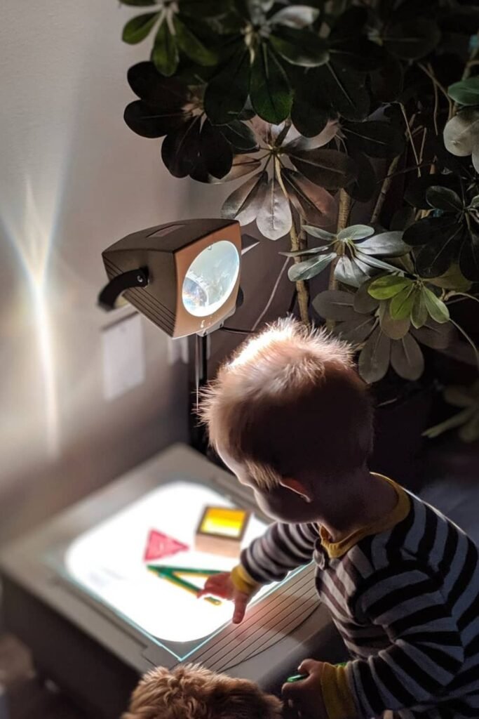 Dim the room and suddenly curiosity becomes quiet. A small projector or overhead light shining onto a flat surface turns simple shapes.