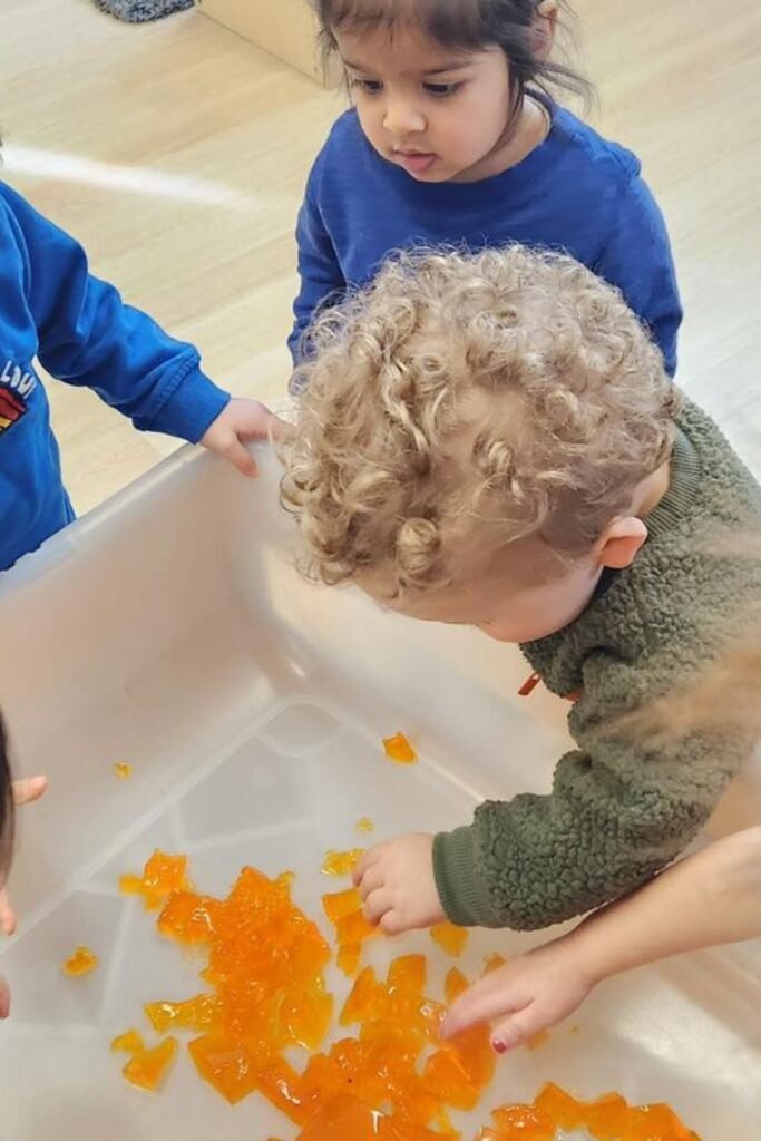 Cool, squishy textures instantly grab attention. Drop pieces of firm jelly or gelatin into a large clear bin.