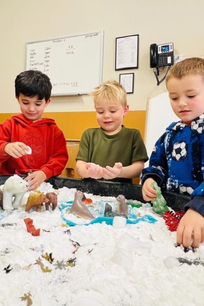 Cold texture slows everything down. Fill a shallow bin with fake snow or crushed ice, add a few animal figurines.