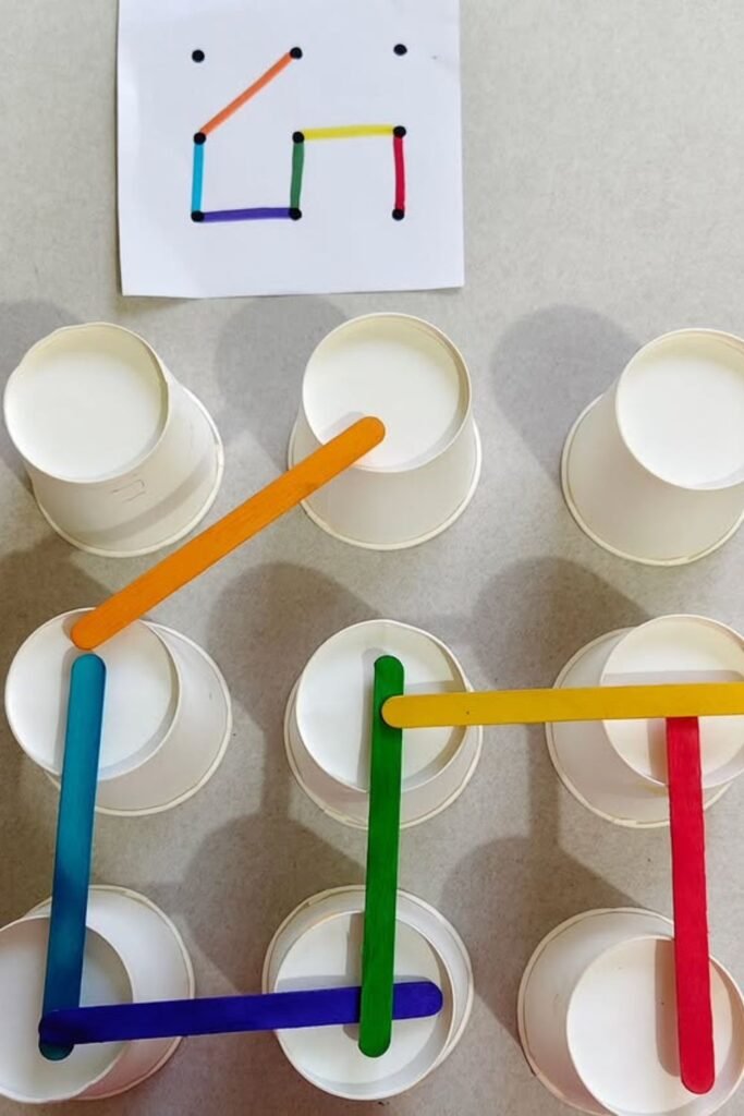 Simple materials can create serious focus. Arrange paper cups in rows and hand over a few colored craft sticks.