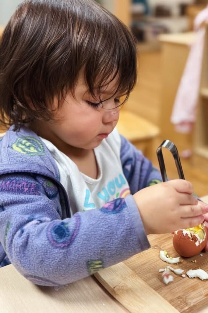 Careful hands change everything. Give a hard-boiled egg and a small bowl, then let your child peel it slowly piece by piece.