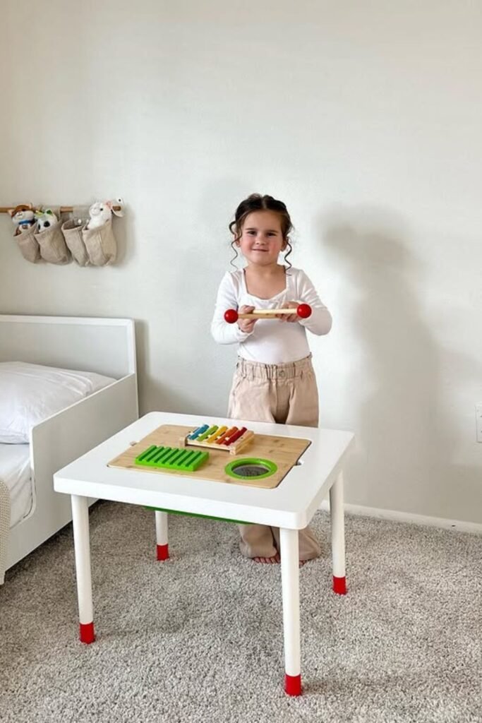 Rhythm can be quiet when it’s controlled. A wooden hammer board with pegs or balls gives kids the satisfaction of tapping without turning the room chaotic.