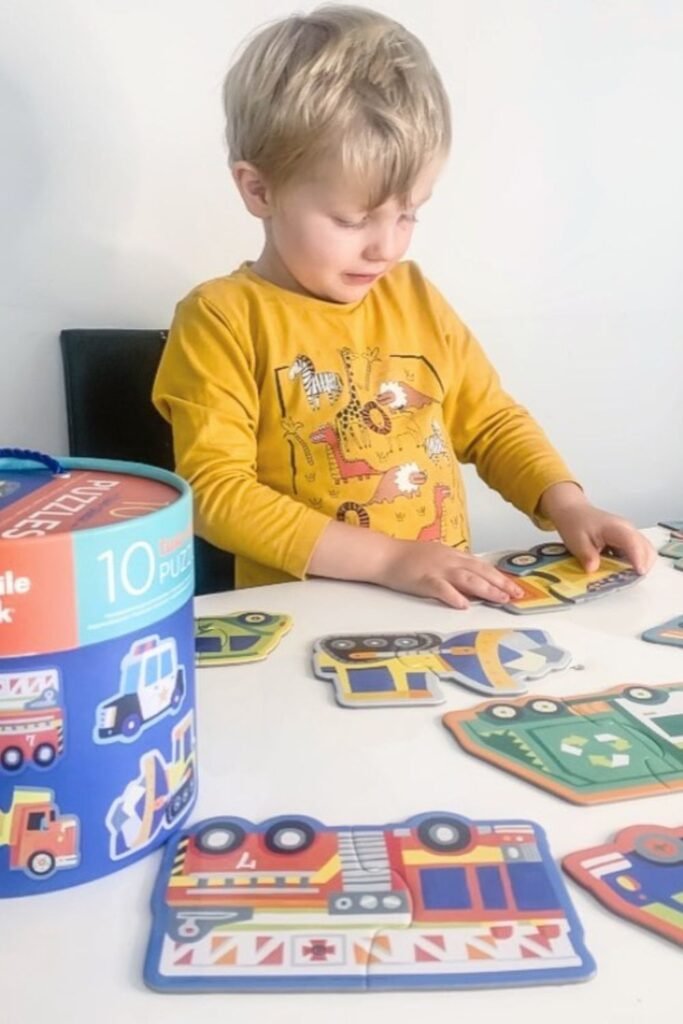 Piece by piece, the room gets quieter. Large floor puzzles or chunky tabletop puzzles give kids a clear goal.