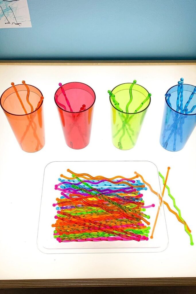 Sorting feels almost meditative when every piece has a place. Fill clear cups with different colored sticks and dump a mixed pile onto a tray.