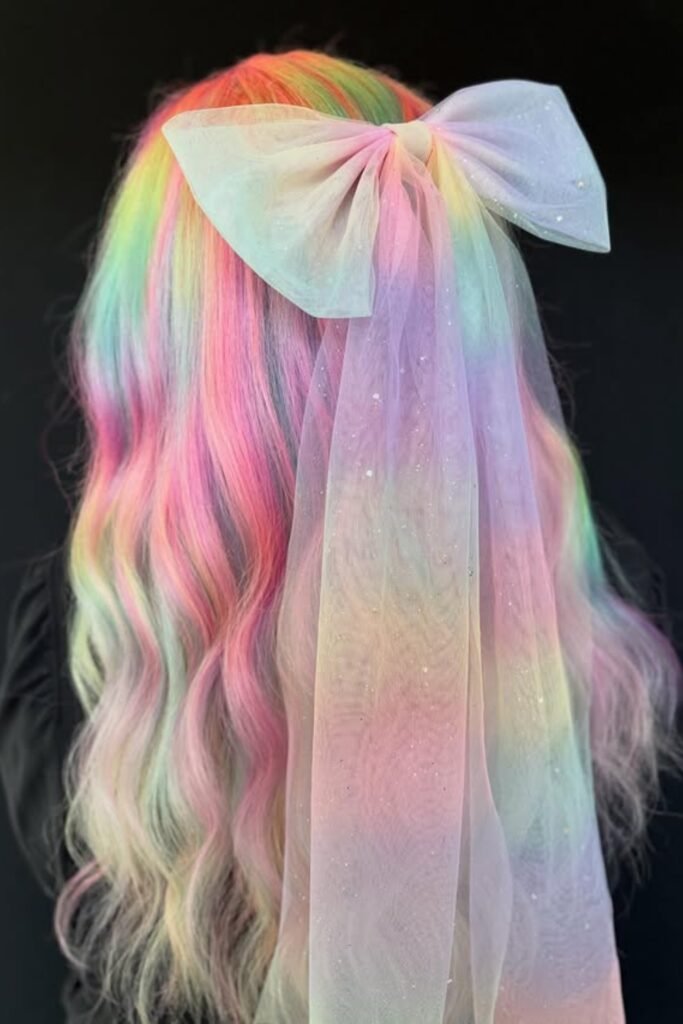 Soft rainbow waves paired with a sheer bow create the perfect fairytale moment.