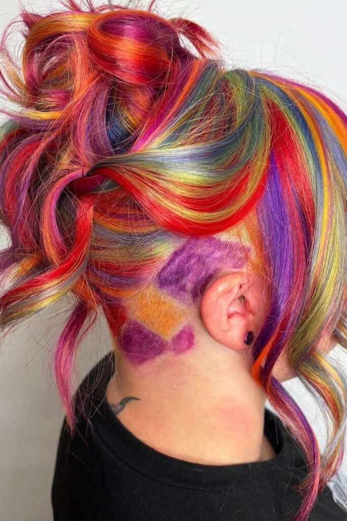 A vivid rainbow blend paired with a shaved geometric undercut turns hair into wearable art.