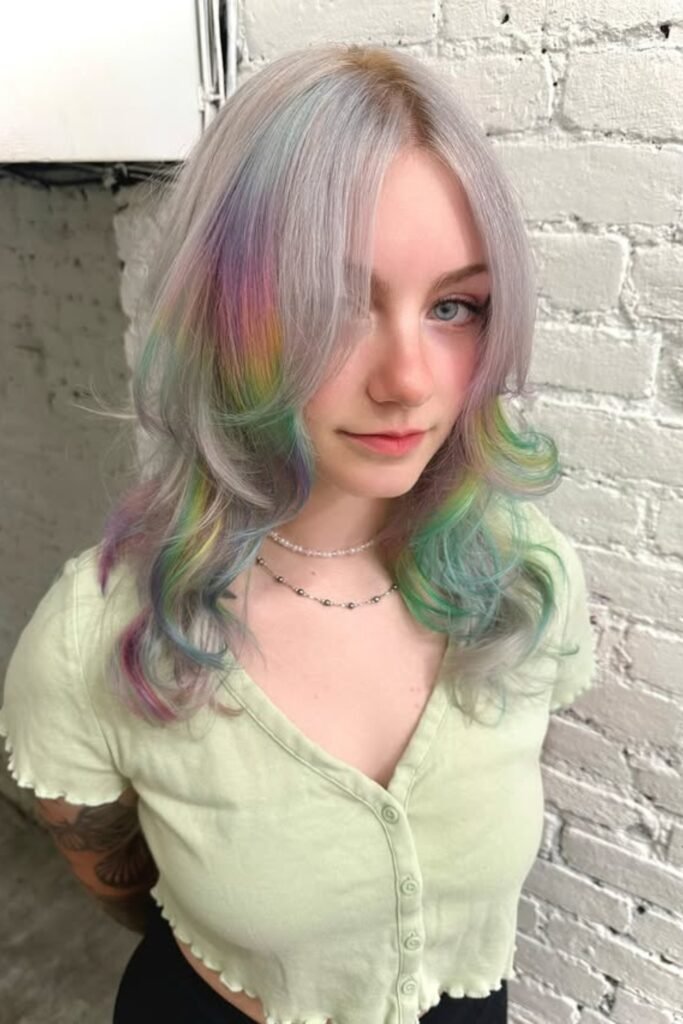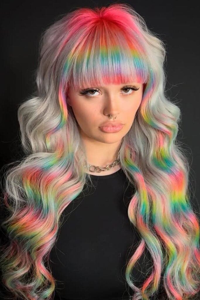 Soft silver waves paired with a bright rainbow fringe make this hairstyle impossible to ignore.